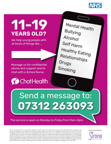 Chat Health is a confidential text messaging service run by our School Nursing service. It allows students to contact healthcare professionals about a range of issues including emotional health and wellbeing, relationships, smoking, stress and anxiety, self-esteem, bullying, drugs and alcohol and sexual health, however it is not an emergency service. Click this link.