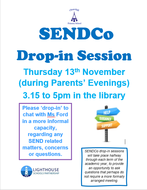 Each term Ms Ford will be holding informal drop-in sessions for any parents/carers who would like to come and ask questions, advice, guidance with regard to SEND.  These will be advertised on here as well as in our school newsletters, with posters on class windows.  The date for Term 1 is:
