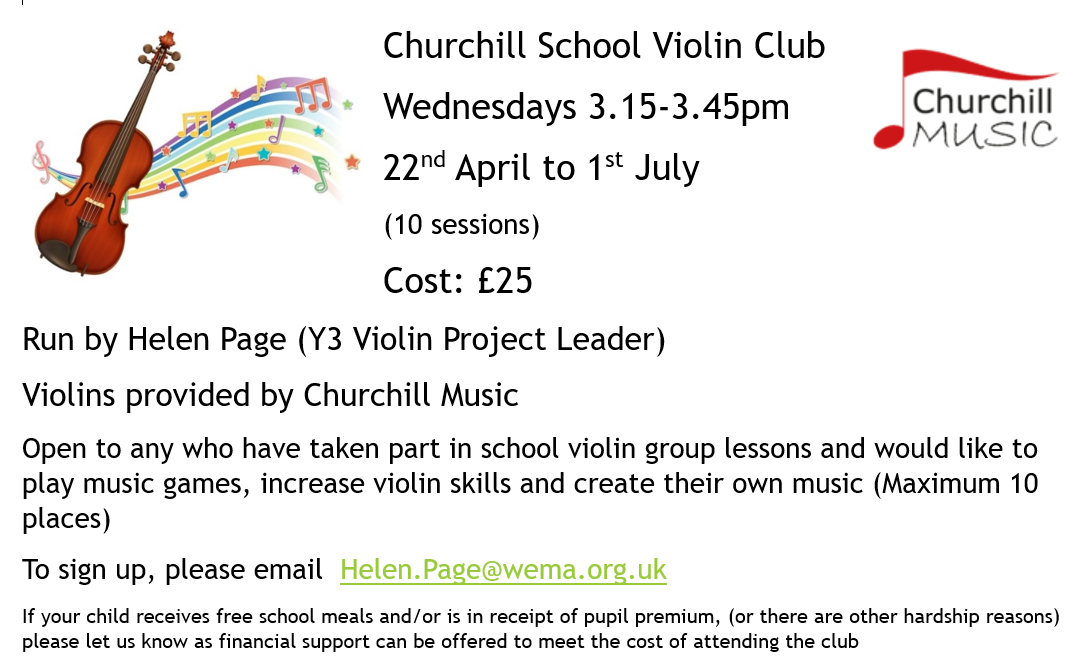 We are also part of the Year 3 Violin Project which is organised through Churchill Music, who also partially fund the project.  This gives every pupil in Year 3 the opportunity to learn to play the violin by accessing 10 weeks of half hour sessions with Helen Page, an experienced violin teacher who has worked with us for a number of years.  All pupils in Year 3 are offered this opportunity at some point in that academic year.  Helen also runs a violin club after schools on a Wednesday for any pupils who wish to play the violin or viola more - this is open to any pupils who have completed the Year 3 Violin Project or who already have violin or viola lessons.  This is a lovely opportunity to play as part of a small string ensemble.  Please see details below on how pupils can join the group and the dates for the coming term:
